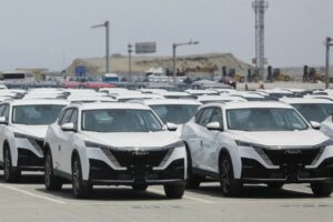 Vehículos eléctricos chinos se encuentran estacionados en el megapuerto de Chancay, Perú. 13 de noviembre de 2025. Fotografía tomada a través de una ventana. REUTERS/Gerardo Marin