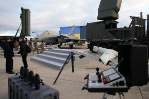 Un caza Rafale, drones y munición antes de la llegada del presidente ucraniano Volodímir Zelenski, a la base aérea de Villacoublay, cerca de París, el lunes 17 de noviembre de 2025. Christophe Ena/Pool vía REUTERS