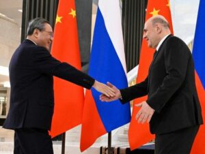 FOTO DE ARCHIVO. El primer ministro ruso, Mijaíl Mishustin, estrecha la mano del primer ministro chino, Li Qiang, antes de una reunión al margen del Consejo de Jefes de Gobierno de los Estados miembros de la Organización de Cooperación de Shanghái (OCS) en Moscú, Rusia. 17 de noviembre de 2025. Sputnik/Alexander Miridonov/Pool vía REUTERS