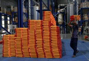 A worker carries sacks filled with rice after being proceed and packed at Araliya Rice Mills factory in Polonnaruwa, Sri Lanka, October 27, 2025. REUTERS/Thilina Kaluthotage