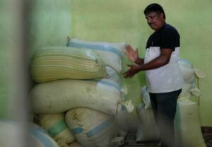 K. K. G. Thilakabandara, chairman of a local farmer’s association, stands next to sacks filled with paddy grains, in Dehiattakandiya, Sri Lanka October 28, 2025. REUTERS/Thilina Kaluthotage