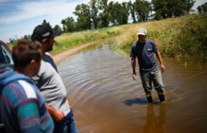 El granjero Alejandro Vallan, de 43 años, conversa con su colega Franco Esteban, 39 años, mientras camina por un camino rural anegado en 12 de octubre, en una inundación que afecta al centro de la provincia de Buenos Aires, donde hay un total de 1,5 millones de hectáreas en riesgo, provincia de Buenos Aires, Argentina, November 17, 2025. REUTERS/Agustin Marcarian