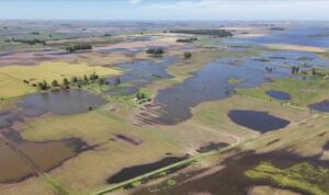 Una vista de dron muestra agua de inundación cubriendo campos agrícolas en 12 de Octubre, donde las lluvias excesivas han dejado más de 1,5 millones de hectáreas en riesgo de permanecer improductivas, en la provincia de Buenos Aires Argentina. Nov 17, 2025. REUTERS/Agustin Marcarian
