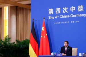 El vicecanciller y ministro de Finanzas alemán, Lars Klingbeil, observa durante la entrega de declaraciones tras una reunión de alto nivel en la Casa de Huéspedes del Estado Diaoyutai en Pekín, China, 17 de noviembre de 2025. REUTERS/Maxim Shemetov/Pool