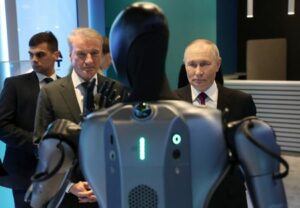 Russian President Vladimir Putin and Sberbank’s CEO German Gref visit the exhibition of the international conference on artificial intelligence “AI Journey”, in Moscow, Russia, November 19, 2025. Sputnik/Vyacheslav Prokofyev/Pool via REUTERS