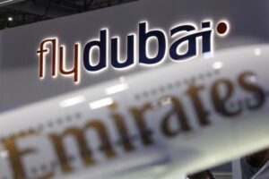The logos of ‘flydubai’ and ‘Emirates’ feature on displays at the Dubai Airshow, in Dubai, United Arab Emirates, November 17, 2025. REUTERS/Amr Alfiky