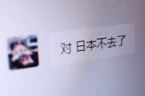 FILE PHOTO: A Chinese chat message between a travel agency staff member and a customer reading ‘I won’t go to Japan’, as a part of messages announcing trip cancellations from the customer, appears on a computer screen at East Japan International Travel Service Co. , a Tokyo-based travel agency, amid escalating tension between China and Japan, in Tokyo, Japan November 18, 2025. REUTERS/Issei Kato/File Photo