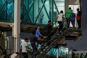 Migrantes venezolanos que habían sido detenidos en El Salvador suben las escaleras hacia la terminal tras desembarcar de un avión en el Aeropuerto Internacional Simón Bolívar de Maiquetía, Venezuela, 18 de julio de 2025. REUTERS/Leonardo Fernández Viloria