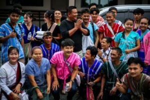 Longan farm owner and purchasing officer for longan exports Narongvaje Maharsatetapong, 54, gestures as he poses with a group of refugees from Myanmar, including members of ethnic communities Karen, Mon, Shan, Rakhine and Burman, who were granted work permits by the Thai government, after an orientation session before working at longan farms in Chanthaburi province, Thailand, November 5, 2025. REUTERS/Athit Perawongmetha
