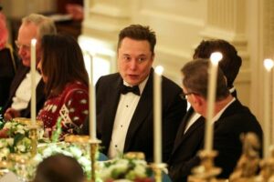 Elon Musk nimmt an einem Abendessen teil, das US-Präsident Donald Trump für den saudischen Kronprinzen und Premierminister Mohammed bin Salman im Weißen Haus veranstaltet, Washington, D.C., USA, am 18. November 2025. REUTERS/Tom Brenner