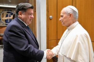 Illinois Governor JB Pritzker shakes hands with Pope Leo XIV at the Vatican, November 19, 2025. Simone Risoluti/Vatican Media/Handout via REUTERS ATTENTION EDITORS – THIS IMAGE WAS PROVIDED BY A THIRD PARTY.