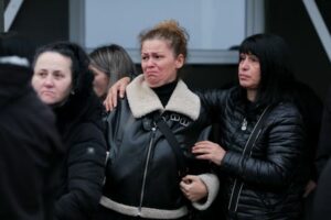 Family members look on while North Macedonian police escort the suspects over the deadly Kocani nightclub fire at the courthouse in Idrizovo, North Macedonia, November 19, 2025. Thirty seven people have been charged in connection with the fatal disco fire in Kocani in March, which killed 63 people. REUTERS/Valdrin Xhemaj