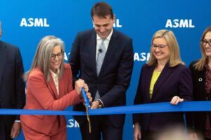 Arizona Gov. Katie Hobbs, Advanced Semiconductor Materials Lithography (ASML) CEO Christophe Fouquet and Phoenix Mayor Kate Gallego cut a ceremonial ribbon during the ASML U.S. Technical Training Academy unveiling in Phoenix, Arizona, U.S., November 20, 2025. REUTERS/Rebecca Noble
