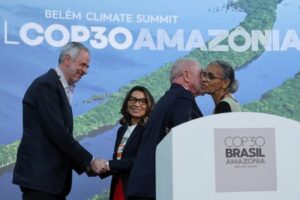El Presidente de Brasil Luiz Inacio Lula da Silva, la Ministra de Medio Ambiente y Cambio Climático Marina Silva, el Presidente de la COP30 y Embajador Andre Correa do Lago, y Rosangela “Janja” da Silva interactúan durante la Conferencia de la ONU sobre Cambio Climático (COP30), en Belem, Brasil, 19 de noviembre de 2025. REUTERS/Adriano Machado