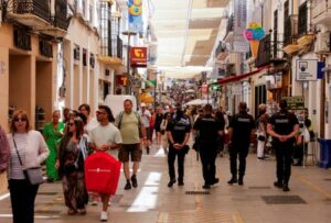 FOTO DE ARCHIVO: Agentes de la policía nacional española caminan junto a los turistas, mientras patrullan una calle comercial, en Ronda, España 19 de mayo 2025. REUTERS/Jon Nazca