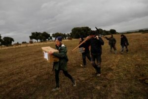 Nuria Maqueda, a member of the Association for the Recovery of Historical Memory (ARMH), carries a box with the remains of one of the two victims who were shot in 1936 by the forces of Spanish dictator Francisco Franco, after the exhumation near Vegas de Matute, Spain, November 13, 2025. REUTERS/Susana Vera