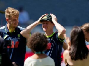 Cricket – The Ashes – Australia v England – First Test – Perth Stadium, Perth, Australia – November 21, 2025 Debutant Australia’s Brendan Doggett receives his first cap before the start of play on day one REUTERS/Asanka Brendon Ratnayake