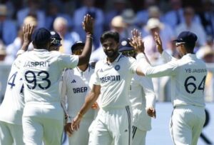 Cricket – International Test Match Series – Third Test – England v India – Lord’s Cricket Ground, London, Britain – July 10, 2025 India’s Nitish Kumar Reddy celebrates with teammates the wicket of England’s Ben Duckett Action Images via Reuters/Peter Cziborra