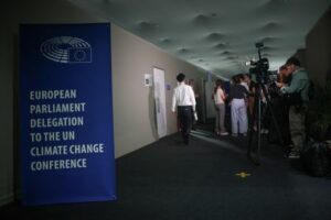 Members of the media wait by the European Parliament meeting room, during the UN Climate Change Conference (COP30), in Belem, Brazil, November 21, 2025. REUTERS/Adriano Machado