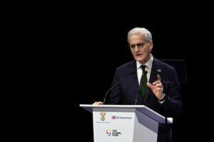 Norway’s Prime Minister Jonas Gahr Store speaks during the Global Fund event on November 21, 2025, in Sandton, Johannesburg, South Africa, ahead of the G20 Summit, which begins tomorrow. Leon Neal/Pool via REUTERS