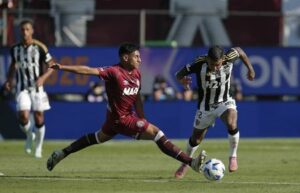 Fútbol – Copa Sudamericana – Final – Lanús v Atlético Mineiro – Estadio Defensores del Chaco, Asunción, Paraguay – 22 de noviembre de 2025. Dudu, de Atlético Mineiro, en acción con Agustín Medina, de Lanús REUTERS/Cesar Olmedo