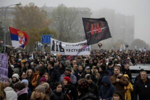 Students and citizens march along a street, marking the first anniversary of the start of their protest movement over of the fatal November 2024 Novi Sad railway station canopy collapse which triggered nationwide accusations of widespread corruption and negligence, in Belgrade, Serbia, November 22, 2025. REUTERS/Djordje Kojadinovic