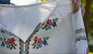 Kateryna Golizdra holds her only remaining Ukrainian blouse for a photograph outside her home in Margate, Florida, U.S., November 17, 2025. REUTERS/Maria Alejandra Cardona
