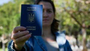 Kateryna Golizdra holds her Ukrainian passport for a photograph outside
