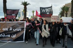 Tunisians march in the capital to protest against Tunisia’s President Kais Saied accusing him of entrenching one-man rule through the use of the judiciary and police, in Tunis, Tunisia November 22, 2025. REUTERS/Jihed Abidellaou