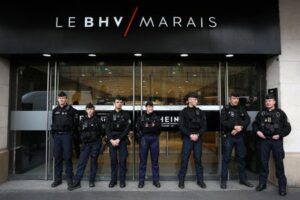 French police secure the entrance of the Le BHV Marais department store, the Bazar de l’Hotel de Ville, on the day of the opening of the first physical space for Chinese online fast-fashion retailer Shein within the Parisian department store, in Paris, France, November 5, 2025. REUTERS/Abdul Saboor