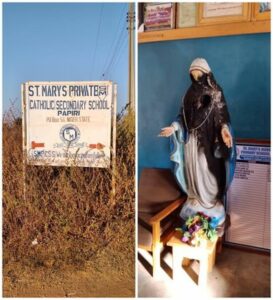 A combination of undated handout images obtained by Reuters on November 23, 2025, following reports of a kidnapping of more than 300 children and staff from St. Mary’s School, in Papiri, Niger state, Nigeria, on November 21, 2025, shows a sign directing to the Catholic school and a damaged figure of the Virgin Mary at the school. Social Communications Department/Catholic Diocese of Kontagora/Handout via REUTERS