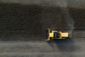 FOTO DE ARCHIVO: Una imagen de dron muestra a un trabajador agrícola operando una segadora durante la temporada de cosecha de soja en el estado más meridional de Brasil, en una granja en Lagoa dos Tres Cantos, estado de Rio Grande do Sul, Brasil. 1 de abril de 2025. REUTERS/Diego Vara/Archivo