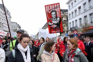 ARCHIV: Ein Demonstrant hält ein Plakat mit dem Bild des belgischen Premierministers Bart De Wever, während einer Demonstration während eines landesweiten Streiks gegen die Reformpläne der belgischen Regierung in Brüssel, Belgien, am 14. Oktober 2025. REUTERS/Omar Havanna