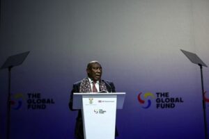 South Africa’s President Cyril Ramaphosa speaks during the Global Fund’s Eighth Replenishment Summit at the Sandton Convention Centre in Sandton on November 21, 2025, ahead of the G20 leaders’ Summit. HENRY NICHOLLS/Pool via REUTERS