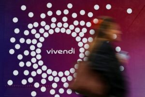 A woman walks past the logo of French media group Vivendi in front the entertainment-to-telecoms conglomerate headquarters in Paris, France, November 24, 2025. REUTERS/Sarah Meyssonnier