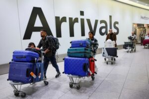 FILE PHOTO: People with luggage arrive at Terminal 4 of the Heathrow International Airport, a day after a fire at a nearby electrical substation wiped out the power at the airport, near London, Britain, March 22, 2025. REUTERS/Isabel Infantes/File Photo